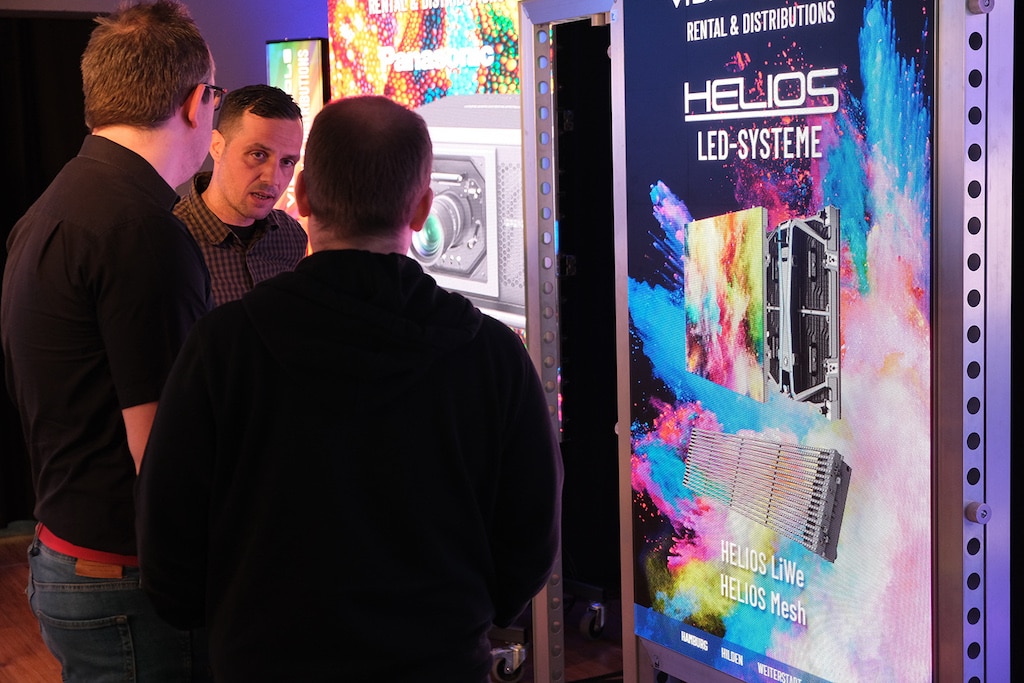 Dazu gehörten Geräte diverser Hersteller sowie die hauseigenen Vision Tools Helios LED-Systeme in diversen Größen und Bauformen. Die Besucher konnten direkt die dargestellten Pixel-Pitches im Bereich von 1,5 mm bis hin zu 8,3 vergleichen.