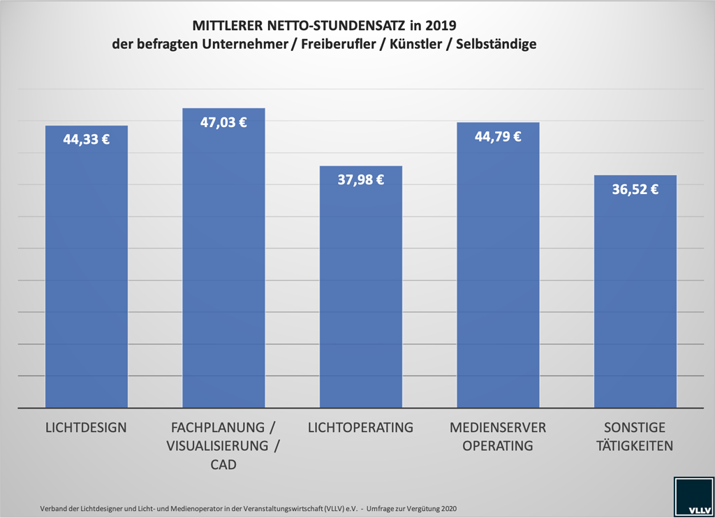 Die im Durchschnitt erzielten Netto-Stundensätze der Selbständigen, Unternehmer, Freiberufler und Künstler lägen signifikant zu niedrig. Sehr deutlich erscheine dies im Bereich Lichtdesign: Hier bestehe ein extremes Missverhältnis zwischen Vergütung und Verantwortungsbereich. Der bereinigte Mittelwert (Medianwert) des Stundensatzes liegt hier lediglich bei netto 40€ – andere in Qualifikation und Komplexität vergleichbare Branchen erlösen laut VLLV durchschnittlich das Doppelte.