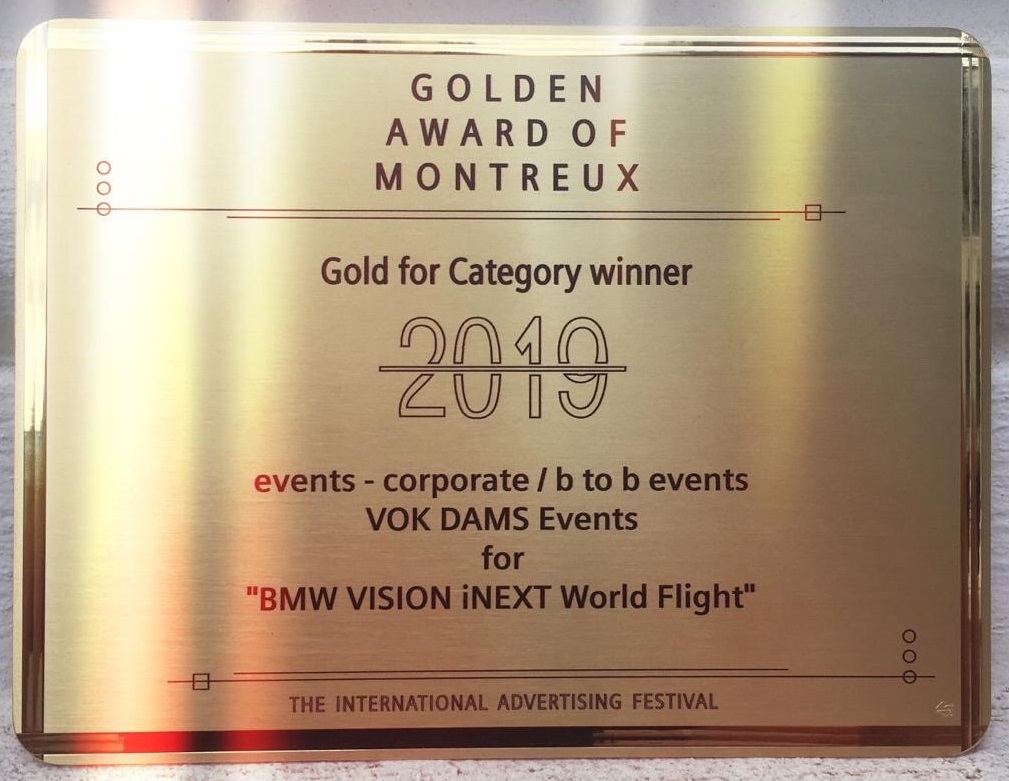 Nach den Auszeichnungen bei den Baltic-Nordic Event Awards und dem Ex Award setzt das Projekt BMW iNEXT World Flight seine internationale Award-Geschichte jetzt mit dem Golden Award of Montreux fort. Die Jury des Golden Award of Montreux zeichnet das Projekt und die verantwortliche Agentur Vok Dams mit einer Gold Medal in der Kategorie Corporate / B to B Events aus.
