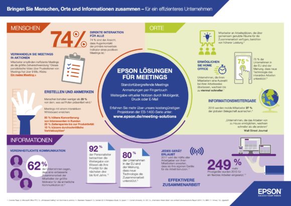 Die Infografik von Epson enthüllt die wichtigsten Trends und Zahlen und zeigt, dass Mobilität, Interaktion und die Weitergabe von Informationen für den Geschäftserfolg entscheidend sind. Erfahren Sie, wie Technologie von Epson Ihnen helfen kann, alle drei Faktoren in einem effizienten, die Zusammenarbeit fördernden Umfeld zu vereinen.