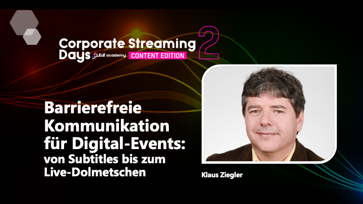 Die Audience eines Digital-Events könnte so viel größer sein – wenn das Streaming barrierefrei und mehrsprachig gestaltet wird. Klaus Ziegler, Konferenzdolmetscher, Berater, Dozent und Übersetzer, erklärt bei den Corporate Streaming Days 2: Content Edition, wie sich eine barrierefreie Kommunikation umsetzen lässt. Das zweitägige Education Digital-Event findet am 14.+15. April 2021 statt.