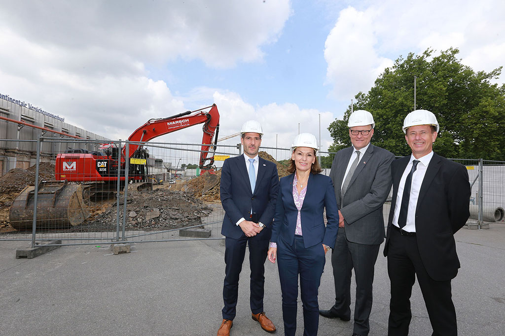 V.l.n.r.: Christian Plothe, Geschäftsführer der Messe Westfalenhallen Dortmund, Sabine Loos, Hauptgeschäftsführerin der Westfalenhallen Dortmund, Frank Weeke, Geschäftsführer der KHC Westfalenhallen und Jochen Meschke, Geschäftsführer der Veranstaltungszentrum Westfalenhallen auf der aktuellen Baustelle. (Bild: Anja Cord)