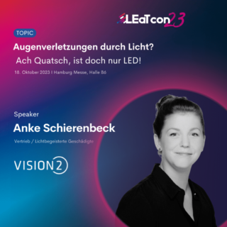 🔦 Anke Schierenbeck, Vertriebsmitarbeiterin der VisionTwo GmbH, diskutiert in dem Panel „Augenverletzungen durch Licht? Ach Quatsch, ist doch nur LED!“ mit anderen Branchenexperten, wie es dazu kommen konnte, dass die Gefährdungsbeurteilung von LED lange Zeit unterschätzt wurde, und wie das Publikum künftig besser geschützt werden kann.