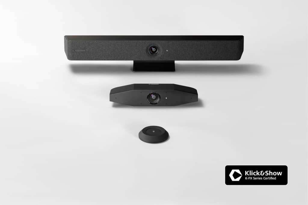 In Kombination mit Klick&Show K-FX lassen sich diese Geräte im Sinne von BYOM (Bring Your Own Meeting) bedienen. Mittels USB-over-WiFi für Conferncing lassen sich die Geräte per USB an das Klick&Show K-FX anschließen und kabellos mit dem Notebook nutzen. Dafür stehen vier USB-Anschlüsse (1x Typ-C, 3x Typ-A) an der Rückseite der Basiseinheit Klick&Show K-FX zur Verfügung. Dabei unterstütze es die Übertragung der Kamerabilder in Full-HD-Auflösung (1920x1080p) bei 30fps.