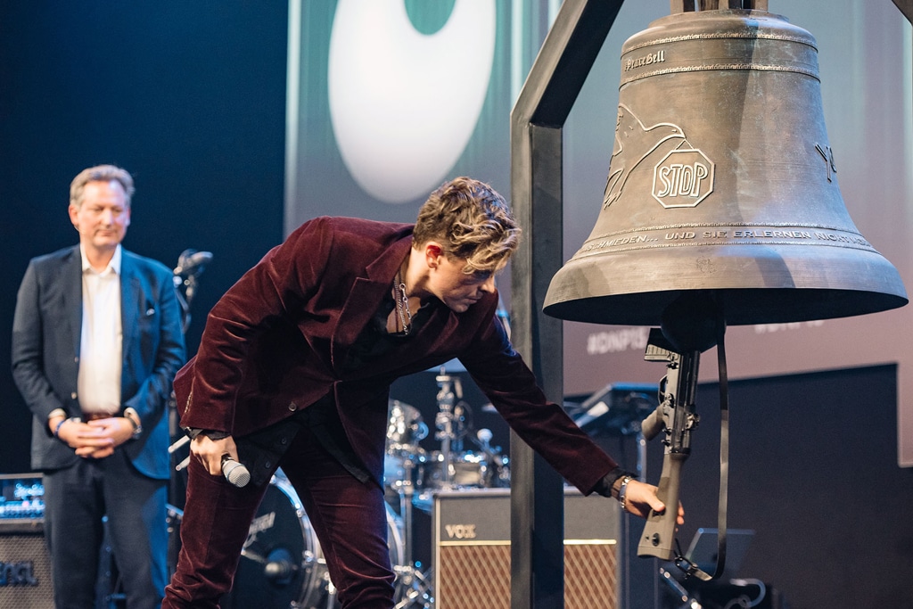 Michael Patrick Kelly mit seinem Projekt #PeaceBell – die Friedensglocke beim Deutschen Nachhaltigkeitspreis 2022. (Bild: Dariusz Misztal)