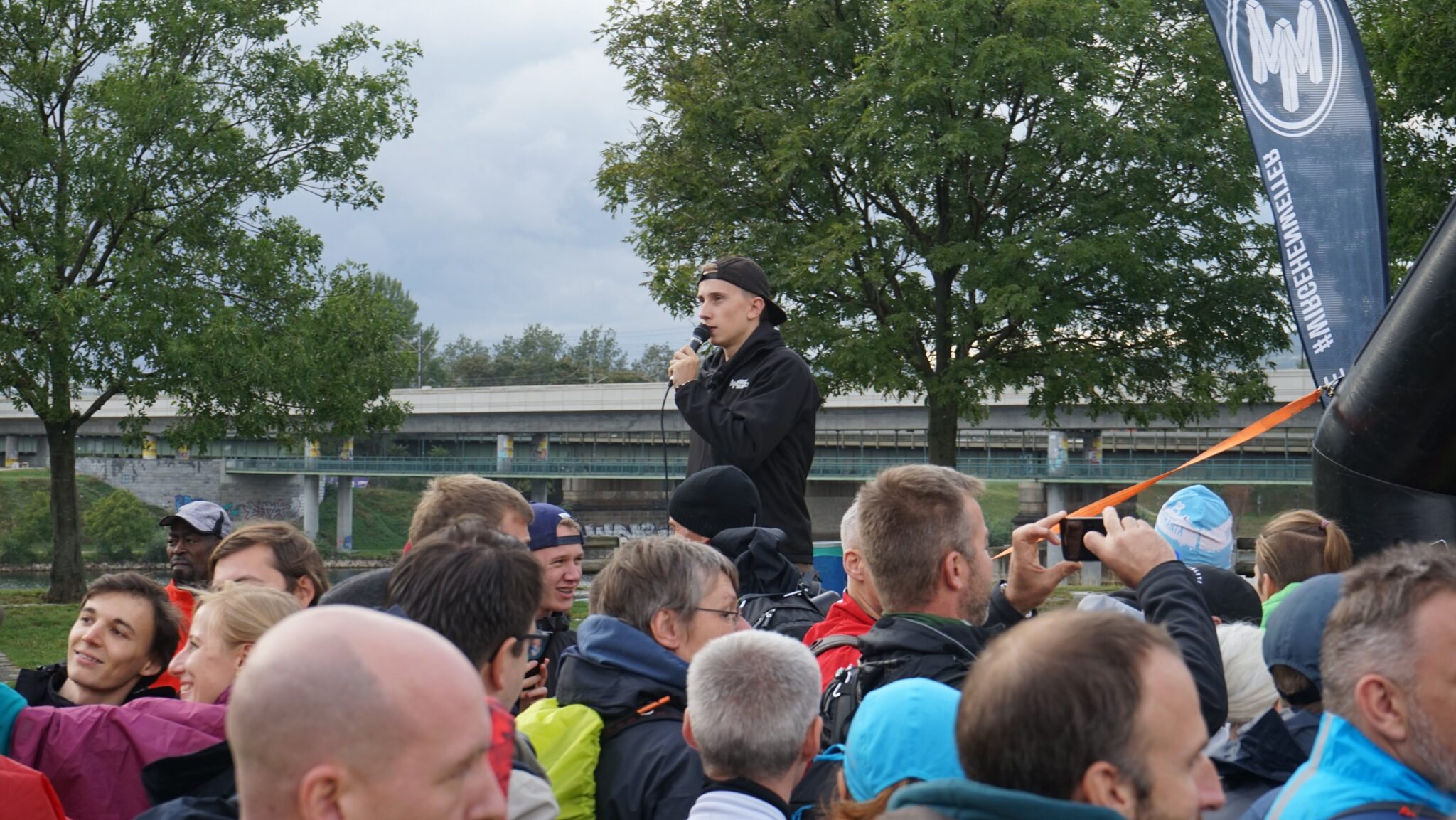 Timo Siebels moderiert den Start des Megamarschs in Wien. (Bild: hundert24 GmbH)
