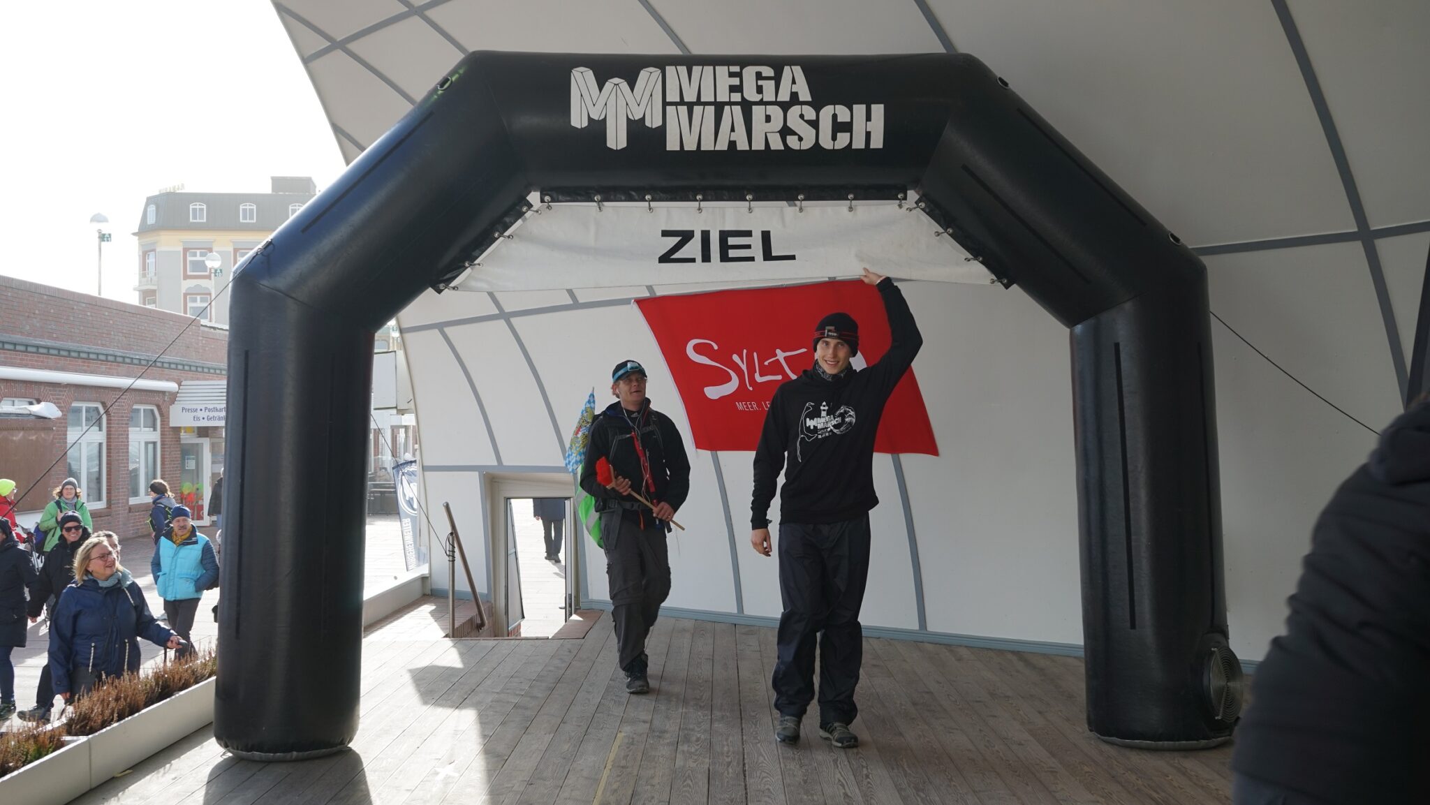 Timo Siebels (r.) durchschreitet den Zielbogen beim Megamarsch auf Sylt. (Bild: hundert24 GmbH)