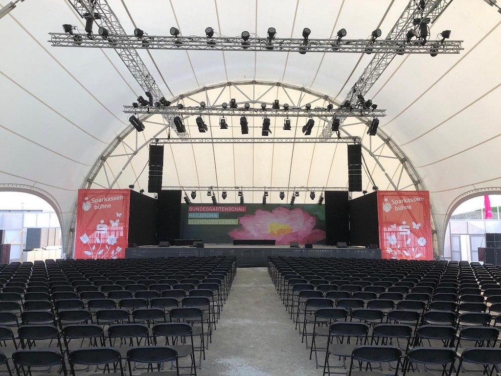 Wie bereits auf der Landesgartenschau 2018 in Würzburg kommt nun auch in Heilbronn die Mott-Lösung für eine Outdoor-Bühne mit Gefälle sowie mit schrägem, unbefestigten Untergrund zum Einsatz. In diesen Zusammenhang kommt das neue Tragsystem „Justo“ ins Spiel. Zusammen mit den höhenverstellbaren Spindeln können alle Unebenheiten leicht und stufenlos ausgeglichen werden, woraus eine stabile und sichere Outdoor-Bühne entsteht. Mit dem großen Vorteil, dass kein Gerüstteil der „Justo“ aus der Bühne herausragt und somit optisch nicht zu sehen ist. Ferner befinden sich alle Füße auf einer Achse. Die Besonderheit an diesem neuen System ist, dass pro Bühnenpodest nicht mehr jeweils vier Steckfüße montiert werden müssen, was eine erhebliche Zeitersparnis bei der Montage bedeutet. D.h. bei der Erstellung einer Steckfuß-Podestbühne von 4 x 6 m werden statt 48 Steckfüße (12 Podeste à 4 Steckfüße) nur noch 20 Füße montiert. Der zweite wesentliche Vorteil ist, dass die Justo-Füße nicht nur als Steckfüße dienen, sondern sich gleichzeitig zur Verbindung der einzelnen Bühnenelemente eignen. In Kombination mit dem Mott Leichtgewicht Praktikus Light ist das neue Justo-Tragessystem einfach und ohne Werkzeug montierbar.