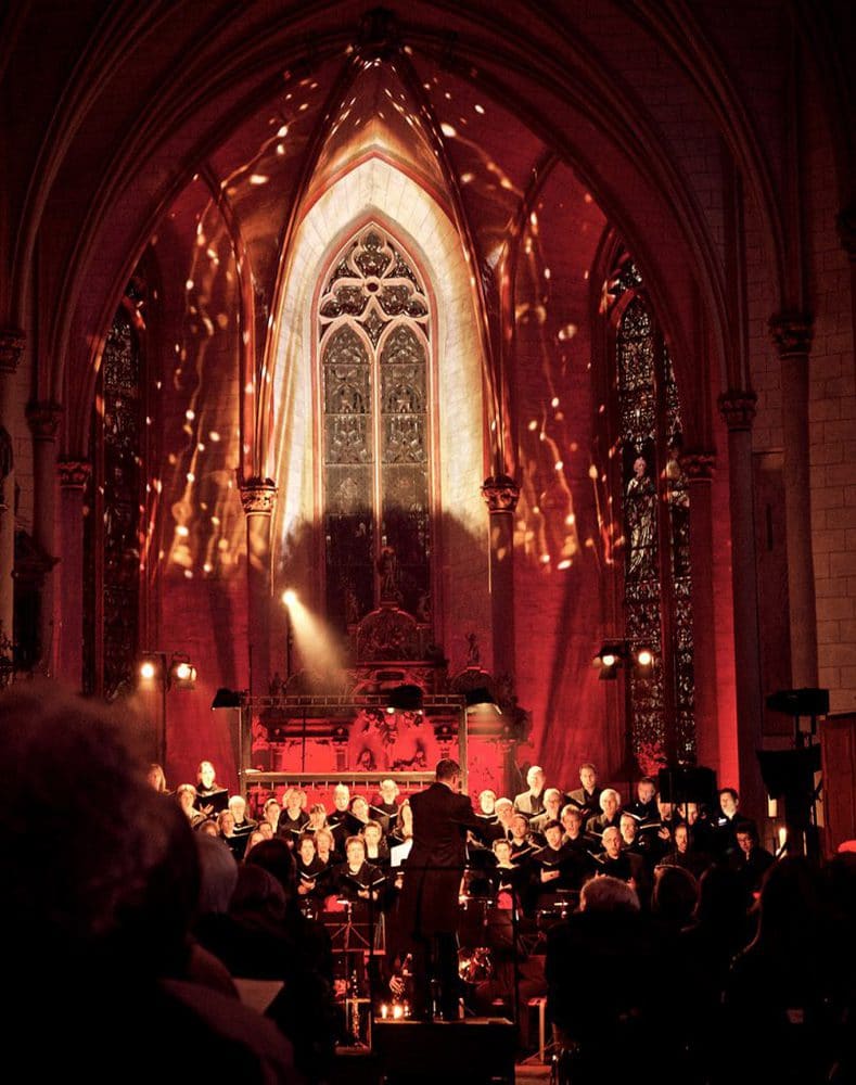 Der international renommierte Licht- und Videodesigner Matt Finke und seine in Marburg ansässige Firma Loop light tauchten die Decke des Altarraums in der Lutherischen Pfarrkirche St. Marien in Marburg zur Premiere des symphonischen Psalms “König David” von Arthur Honegger in ein phantasievolles Meer aus Licht und Farben und nutzten dazu unter anderem Projektoren von Christie.