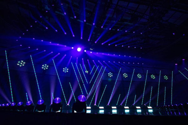 Die impression FR1 dienten dabei in erster Linie dazu, die Bühnenform im Rigg nachzuzeichnen und zu betonen. Darüber hinaus wurden sie auch am Boden an den Schenkeln der Dreiecke als zusätzliche Kantenbetonung integriert.