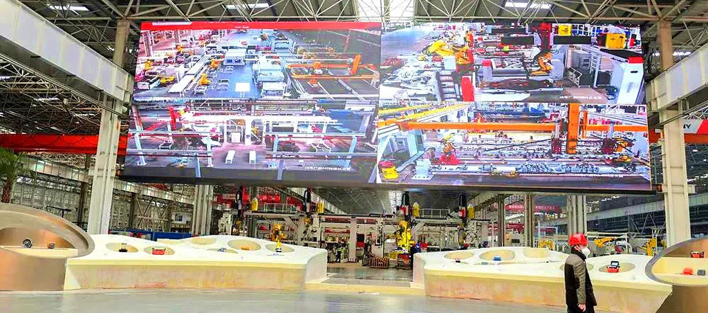 Die 5G-Daten stellen hohe Anforderungen an das Anzeigeterminal, und die KL-Serie ist in der Lage, diese Anforderungen zu erfüllen. Der LED-Bildschirm mit einem Pixelabstand von 2,5 mm ist in der Lage, eine Reihe von Echtzeit-Betriebsbildern in HD anzuzeigen, was den Bedienern helfen soll, kritische Aktivitäten in der Fabrik zu überwachen, einschließlich der Komponenten, die durch die Hängesysteme transportiert werden, und der Roboterarme, die Produktmaterialien handhaben.