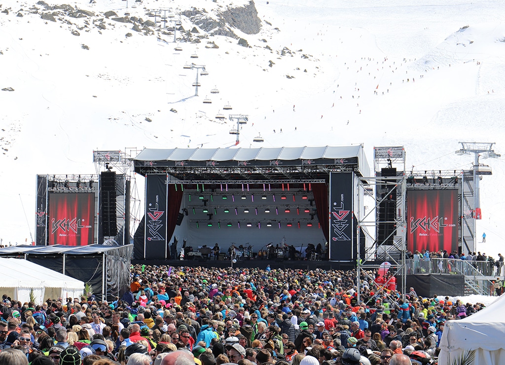 Bekannt ist die Tiroler „Lifestyle-Metropole“ Ischgl nicht nur als Skigebiet, sondern auch für ihre Après Ski- und Spitzen-Events wie z. B. die Konzertreihe „Top of the Mountain“, bei welcher hochkarätige Künstler wie Andreas Bourani und Zucchero vor über 15.000 Gästen auftreten. Voraussetzung: eine fast 200 Quadratmeter große überdachte Bühne mit 15,5 Metern lichter Bühnenweite. Eigentlich Tagesgeschäft für Ebner event logistics aus dem österreichischen Thalgau, wie Layher Produktmanager Florian Tofahrn berichtet. Wenn es da nicht ein interessantes Detail gäbe: „Während die Auftaktveranstaltung am Saisonanfang in Ischgl selbst stattfindet, steigen die Open-Air-Konzerte zu Ostern und am Saisonende jedoch auf den Skipisten der Idalp – auf rund 2.500 Metern Höhe.“