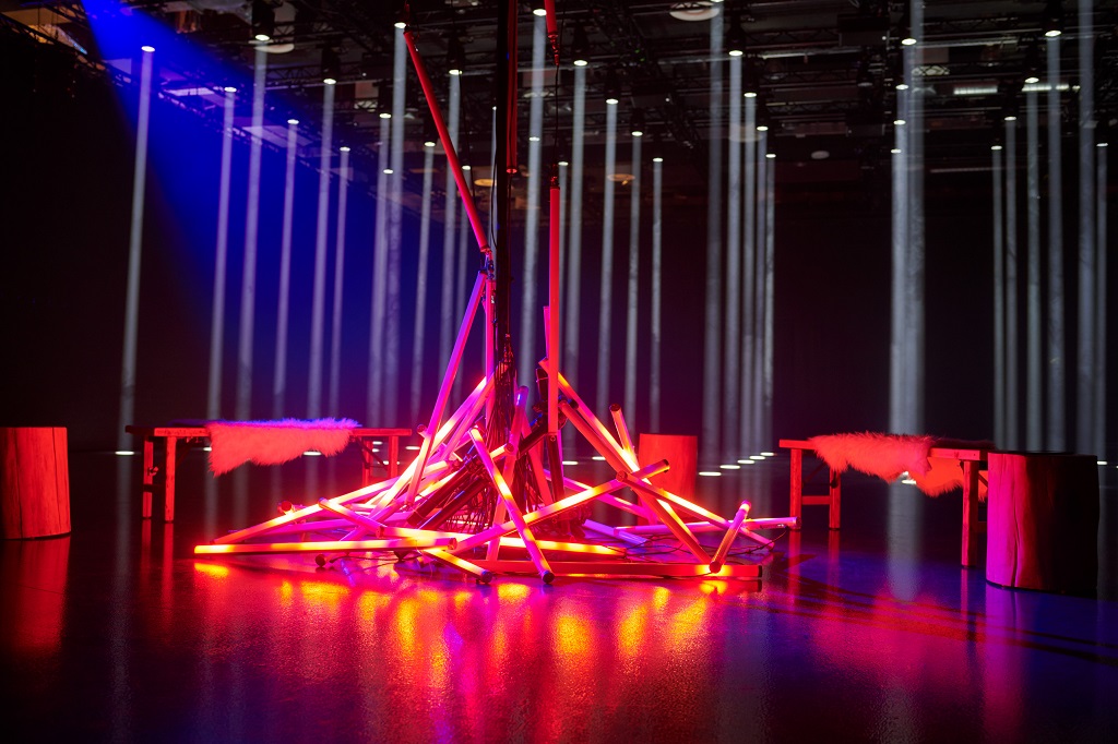 Die Besucher starteten mit dem Licht am Ende des “Tunnels” über einen warmen Empfang am generativen “Camp Fire” in die “Blacktrax Light Experience”, mit “Light Focus” und “Light Follow” und dem gemeinsamen Lichtspiel im “Forrest”. Mit der Kombination aus Blacktrax und Disguise Medienserver führte der Weg zum “Transforming Cube” einem Realtime-Projection-Mapping an einem frei im Raum bewegbaren Objekt. Die virtuellen Metamorphosen – von klarer grafischer Anmutung bis zum pulsierenden Lava Stein – wurde durch die Integration von Notch Realtime-Content in ihrer Illusion vertieft. In einer weiteren Installation steuerte Blacktrax und Notch zusätzlich zum Mapping der drei im Raum getragenen Flächen über eine Annäherungssensorik deren generativen Content sowie das entsprechende Sounddesign.
