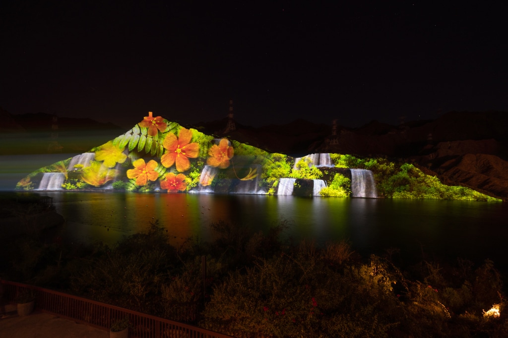 Das Festival feiert es die Architektur sowie die natürliche Umgebung der jeweiligen Gastgeberstadt mithilfe von groß angelegtem Projektionsmapping, um Sehenswürdigkeiten, wie in diesem Fall die Sharjah-Moschee, und das den Al-Rafisah-Damm überblickende Hadschar-Gebirge hervorzuheben.