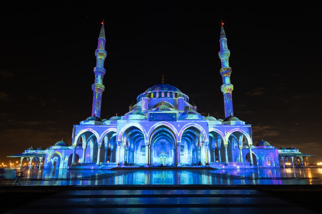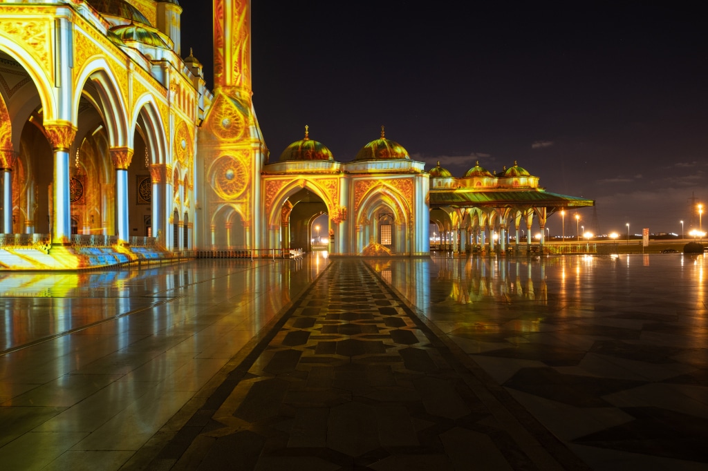 Unter den vier Veranstaltungsorten des Festivals, die Artabesk mit ihrer Kombination aus Titan Laser 37000 WU- und M-Vision 23000 WU-Laserprojektoren bediente, befand sich auch die Sharja-Moschee, die sich in der Stadt Sharjah über 190.000m² erstrecke. Dort kamen Artabesks 21 Titan-Laserprojektoren mit 37.000lm zum Einsatz, um eine lineare Projektion über eine Fläche von 400m² zu realisieren, die sich aufgeteilt auf acht Bereiche über das Bauwerk erstreckte, dessen Minarette allein 40m in die Höhe ragen sollen.