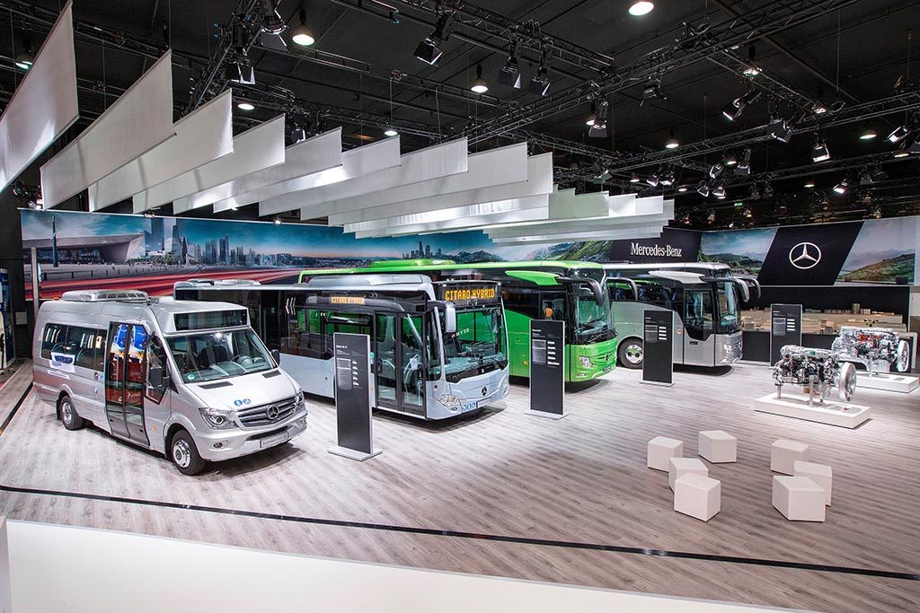 Ziel war es, eine großzügige übergeordnete Kommunikationsplattform mit einem übersichtlichen Gliederungsprinzip für beide Marken zu gestalten. Die Individualisierung der Bereiche erfolgte über Produktinszenierungen, Raumelemente, Farbcodierungen sowie die grafische Gestaltung. Als verbindendes Element zwischen den Fahrzeugpräsentationen von Mercedes-Benz und Setra sorgte eine „Downstream Lane“ für eine Verbindung der Marken. Innerhalb der „Downstream Lane“ präsentierten sich die zu Daimler Buses gehörenden Downstream Marken OMNIplus und OMNIplus ON mit verschieden großen und individuell gestalteten Standflächen. Zudem befand sich innerhalb der „Downstream Lane“ auch ein markenübergreifendes Design Center.