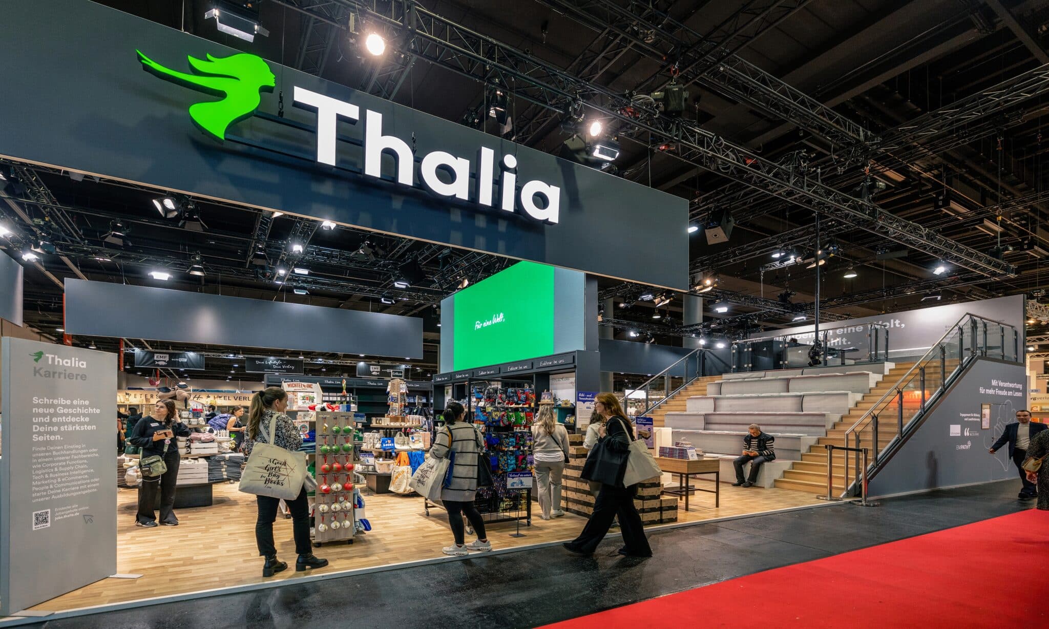 Gemeinsam mit Thalia entwickelten die Frankfurter Marketingagentur und die Hofheimer Messedienstleister die Standkonzepte für die Messepräsentation. Dafür wurden die Markenwerte und die Marktführerschaft des Unternehmens konsequent in den Mittelpunkt gerückt. Im Vordergrund der Gestaltung stand eine Einladung an alle Messebesucher:innen, die Facetten von Thalia zu erleben.