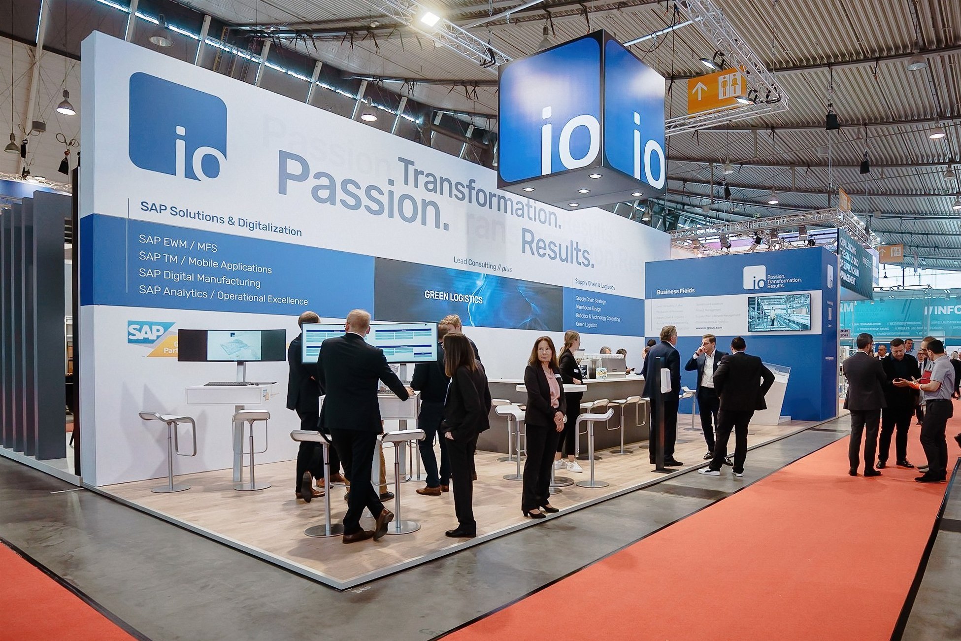 Kommunikation und Austausch mit den Messebesucher:innen zu seinen Dienstleistungen rund um Logistik und SAP stand im Vordergrund des Messeauftritts von io. Für das technische Planungs- und Beratungsunternehmen realisierte Artlife auf einem 70m2 großen Eckstand eine entsprechend dialogorientierte Standarchitektur mit offenen Kontaktzonen, einer integrierten Kaffeebar sowie Beratungsplätzen mit Ultrawide-Monitoren. Weithin sichtbar sollte der Deckenkubus im Zusammenspiel mit der 14 Meter langen, gestalteten Rückwand die Aufmerksamkeit der Besucher:innen auf die Unternehmenspräsenz des Heidelberger Unternehmens unter der Flagge der neuen Dachmarke lenken.
