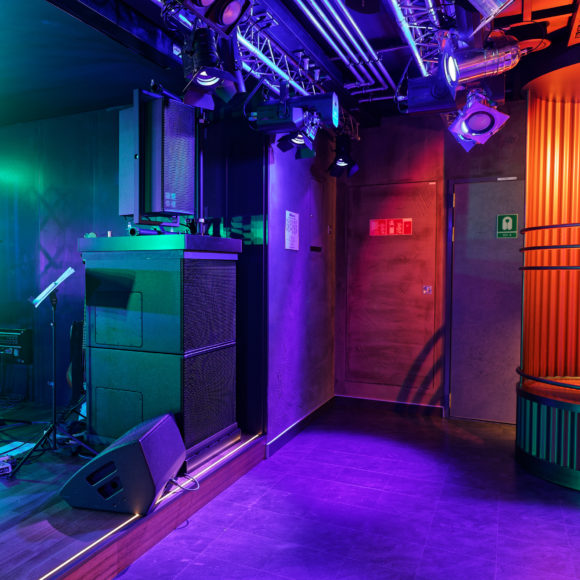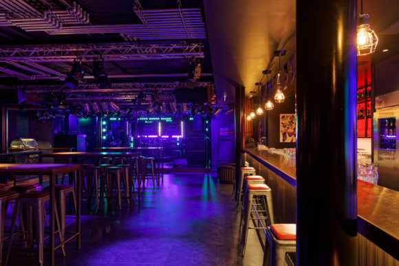 Die d&b audiotechnik Beschallung ist ein deutlich sichtbarer Teil des Ambientes der Rock Box Bar. Backsteinwände, dunkles Mobiliar und geschickt eingesetztes Licht machen die Rock Box Bar zu einem lässigen Pub, deren Decke von Traversen durchzogen ist. Das Lichtdesign setzt vielfach auf PAR-Kannen und ACL-Blinder mit analogen Look, aber energiesparenden LED Leuchtmitteln. (Bild: ASC)