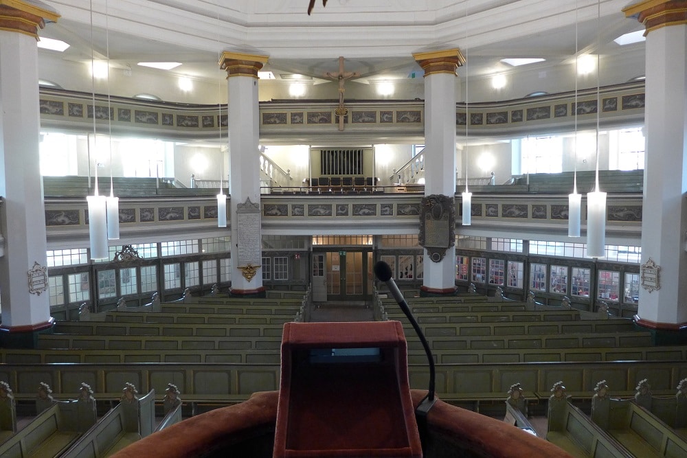 Blick von der Kanzel in den Zuhörerraum: Der oktogonale Bau der Rellinger Kirche mit seiner großen Höhe und 2 Emporen-Ebenen erfordert eine flexible und leistungsstarke Beschallungsanlage. (Bild: Amptown System Company )