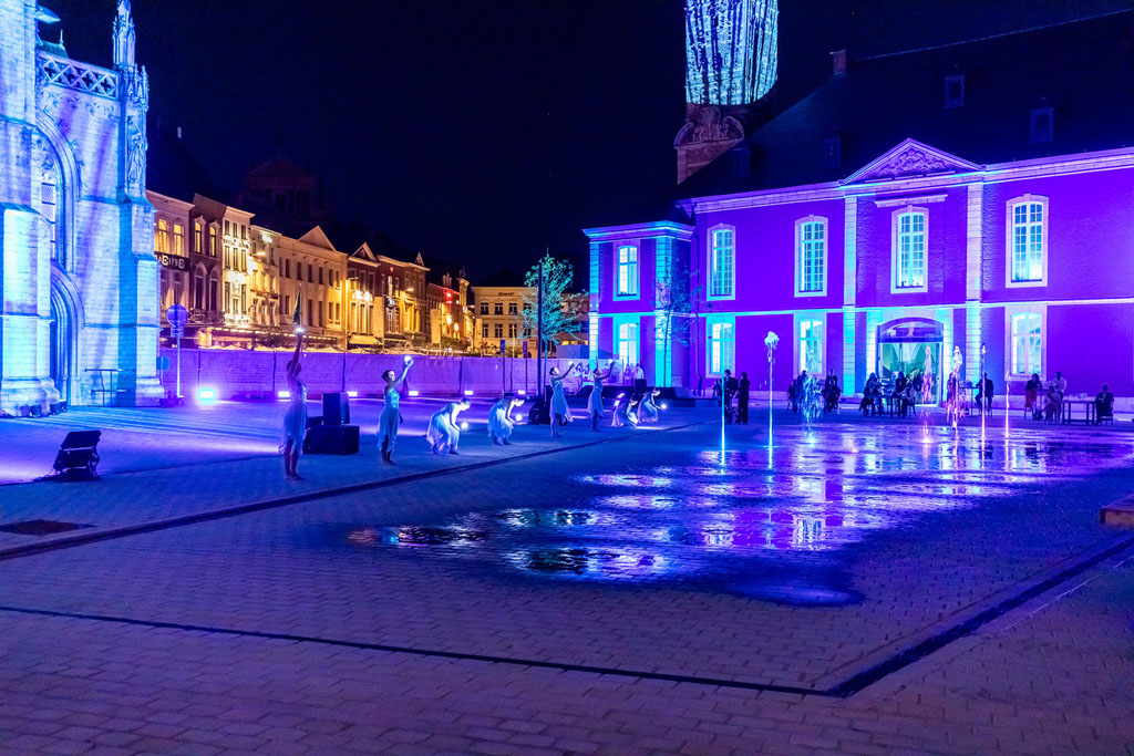 Kristof und TCF entwarfen die Beleuchtung für die Eröffnungsfeier eines neuen Einkaufszentrums auf dem Marktplatz in der belgischen Stadt Sint Truiden, eine Show mit Tänzern und interaktiven Wasserfontänen, wo er AX3s einsetzte, um die Bewegung und den Fluss der Tänzer und des Wassers zu verstärken.