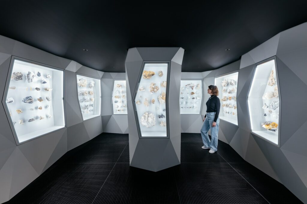 Nach dem Rundgang durch die drei Hauptgeschosse schließt sich im Untergeschoss des Gebäudes die inszenierte „Crystal Cave“ an.  Der Besuchende betritt die raumgreifende Installation über einen dunkel gehaltenen Eingangstunnel. Im ersten Bereich, der „Real Cave“ geht er auf einem schwarzen Gitterroststeg durch eine glitzernde Kristallhöhle, die aus Kristallen des norwegischen Kalkbergwerkes von Brevik nachgebaut wurde – ein immersives Erlebnis. Im angrenzenden Raum, der „Artificial Cave“, entlehnen sich die Vitrinen den prismatischen Formen ihrer Objekte. Höhepunkt der Raumfolge ist die „Glowing Cave“, der die magische Farb- und Formpracht der ausgestellten Steine mithilfe von UV-Licht in Szene setzt.