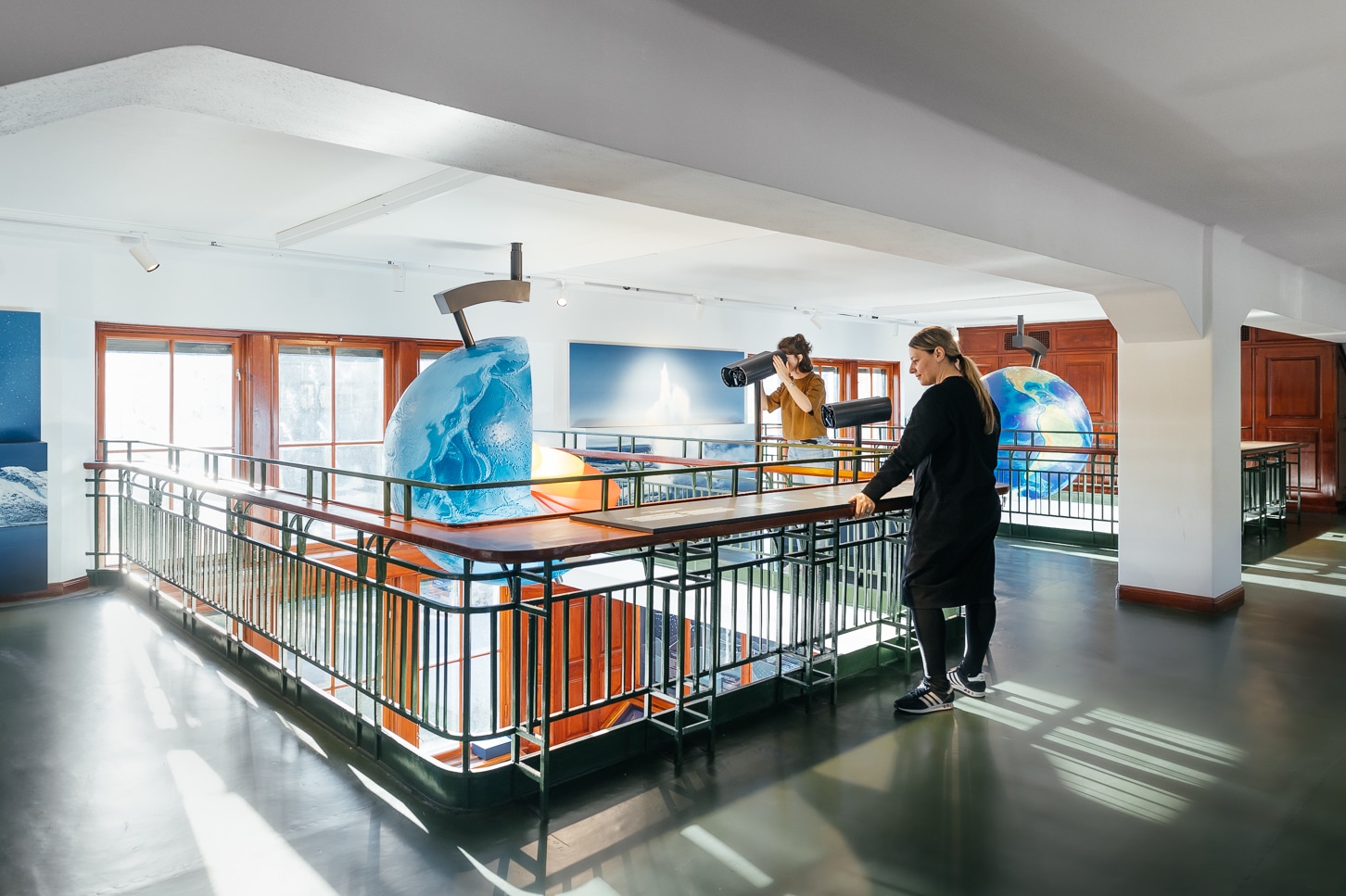 In der Galerie „Dynamic Earth“, im zweiten Obergeschoss, erfahren die Besucher:innen schließlich mehr über unseren sich ständig verändernden Planeten. Zehn Globen in verschiedenen Farben und Texturen füllen die Lufträume der darunter liegenden Galeriebuchten. Jeder Globus steht für einen Prozess; einer davon sind die Meeresströmungen und die damit verbundenen Auswirkungen auf unser Klima. In der Mitte des Raumes finden sich ergänzende Informationen auf den „Tables of Evidence“. Sie präsentieren Phänomene, über welche Wissenschaftler:innen zum Verständnis der Prozesse gelangten. Augmented Reality Ferngläser machen die Prozesse und Phänomene auf den Globen visuell erfahrbar.