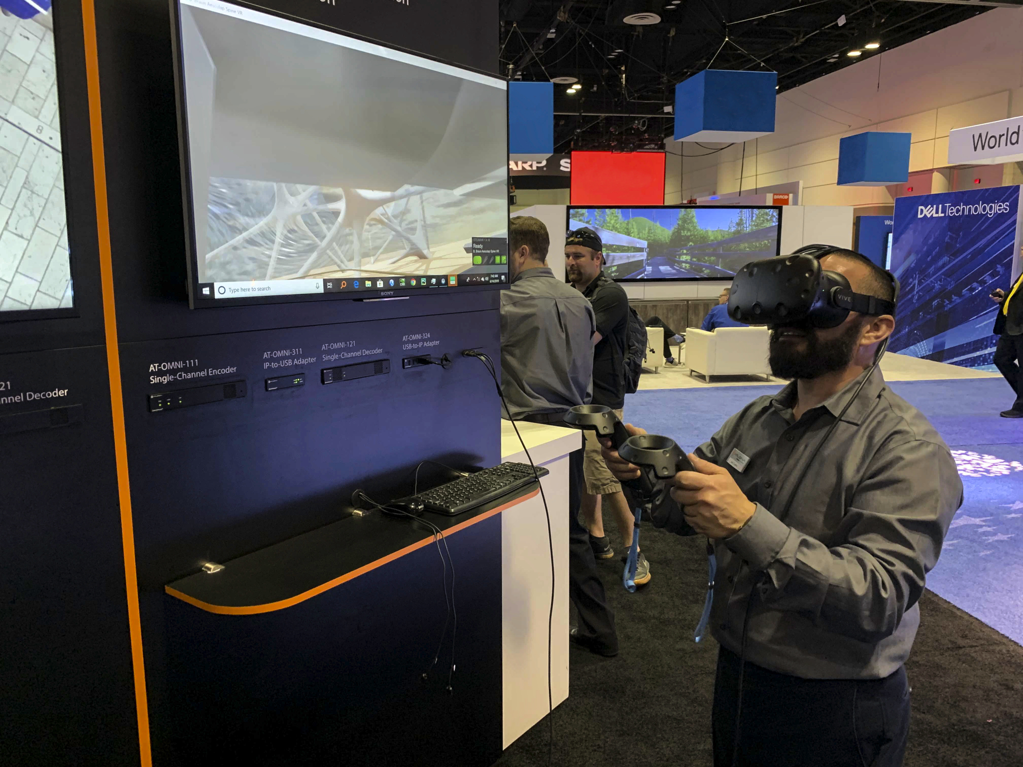 Die OmniStream AV-over-IP-Familie von Atlona unterstützte hierbei die dynamische Darstellung und lieferte ein VR-Erlebnis über Ethernet-Netzwerke mit 1 Gbit/s. Die Besucher des Messestandes erlebten die Demo über VR-Headsets und Controller und konnten so hautnah erleben, wie VR in realen AV-Anwendungen umgesetzt werden kann.