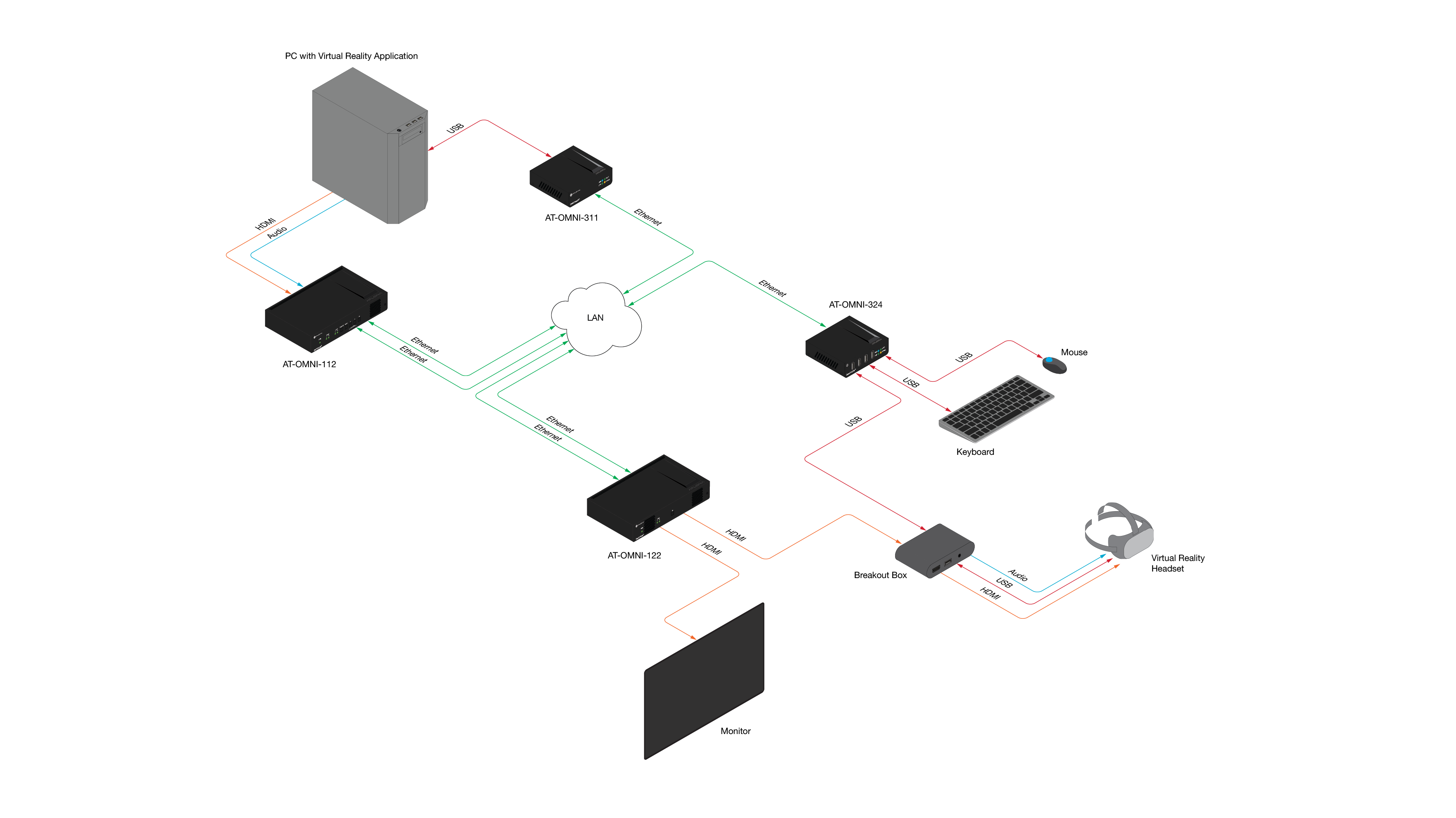 Die vollständige Atlona VR-over-IP-Demonstration nutzte OmniStream AT-OMNI-111 Einkanal-Encoder, AT-OMNI-121 Einkanal-Decoder und über das Netzwerk schaltbare USB-over-IP-Geräteadapter (AT-OMNI-311, AT-OMNI-324).