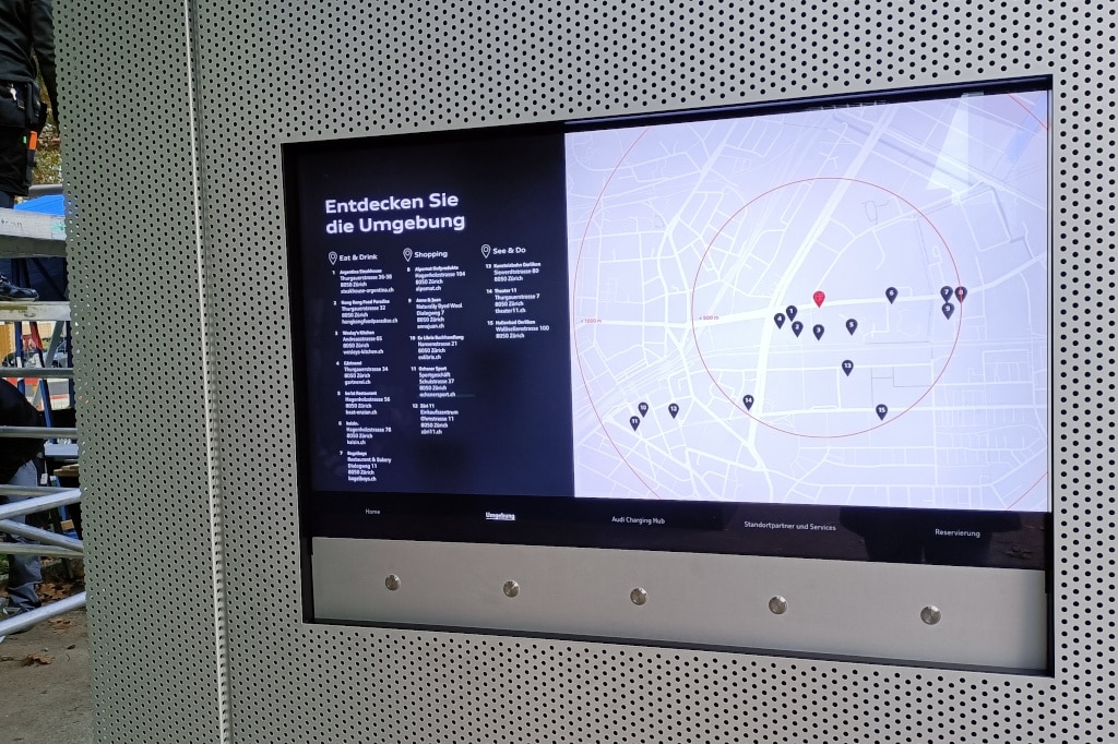 Um über Angebote am und um den Audi charging hub in Zürich, nach einer Pilotphase in Nürnberg im November 2022 eröffnet, zu informieren, kommen zwei 55“ Outdoor-Displays von LG zum Einsatz. Wo das Auffinden einer freien Ladestation bislang eine Herausforderung gewesen sein soll, können Audi-Kund:innen nun per App einen freien Ladeslot für einen der insgesamt vier High-Power-Charging-Ladepunkte buchen.