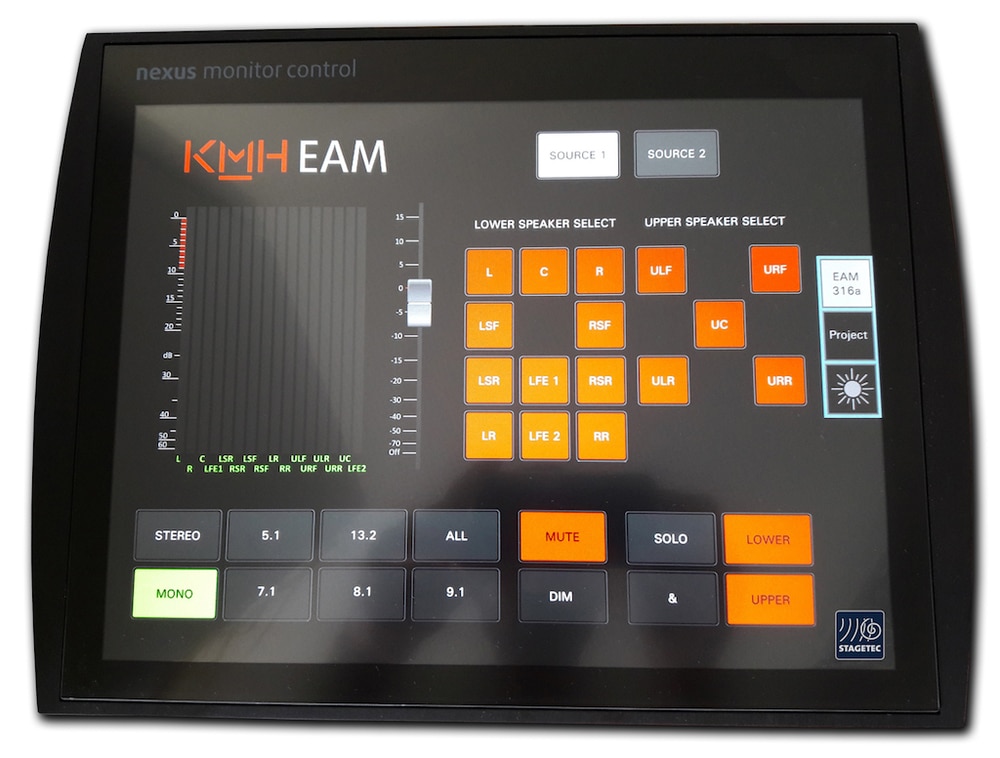 Zur Lieferung gehören auch drei NEXUS Monitor Controller. Die Software der Abhörcontroller musste angepasst werden, weil die Studios der Studenten mit einer ungewöhnlich großen Anzahl von Lautsprechern bestückt sind. „Wir haben lange nach einem Abhörcontroller gesucht, der unsere speziellen Anforderungen erfüllt. Unsere Lautsprecheranordnungen erfordern nämlich Abhörcontroller mit großen Ressourcen. “ erläutert Prof. Bill Brunson von der KMH. „Letztendlich war es dann nur der NEXUS Monitor Controller von Stage Tec, der unsere Vorstellungen perfekt umgesetzt hat.“ In zwei Studios werden jeweils zehn Lautsprecher über den NEXUS Monitor Controller gesteuert, im großen Studio 16 Lautsprecher. Diverse NEXUS-Quellen lassen sich flexibel auf die Controller schalten. Abgehört werden können sämtliche Formate von Mono bis 13.2. Neben der Software wurden auch die GUIs der NEXUS Monitor Controller sehr individuell angepasst: Die Displays stellen nicht nur die Lautsprecheranordnungen dar, sondern auch das Logo der KMH.