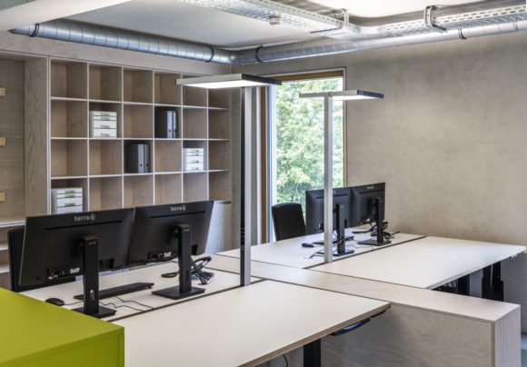 Mit dem Fokus auf der Lichtqualität verzichtet das Erscheinungsbild der LED-Stehleuchte auf überflüssige Elemente. Die klaren Linien fügen sich nahezu in jede Raumumgebung ein. Das Touchpanel-Bedienelement am Leuchtenkorpus ist ebenfalls klar gestaltet und intuitiv nutzbar. Alle verwendeten Materialien sollen den hohen Qualitätsanspruch unterstreichen und sind recyclebar. Da die Betondecken auch beleuchtet werden sollten, konnte auch hier Luctra Vitawork eingesetzt werden. Da die Leuchte direkte und indirekte Beleuchtung kombiniert und eine asymmetrische Lichtverteilung bietet, genügen im großen Arbeitsraum zwei dieses Leuchtentyps, um vier Arbeitsplätze und einen Besprechungsbereich voll ausleuchten zu können.