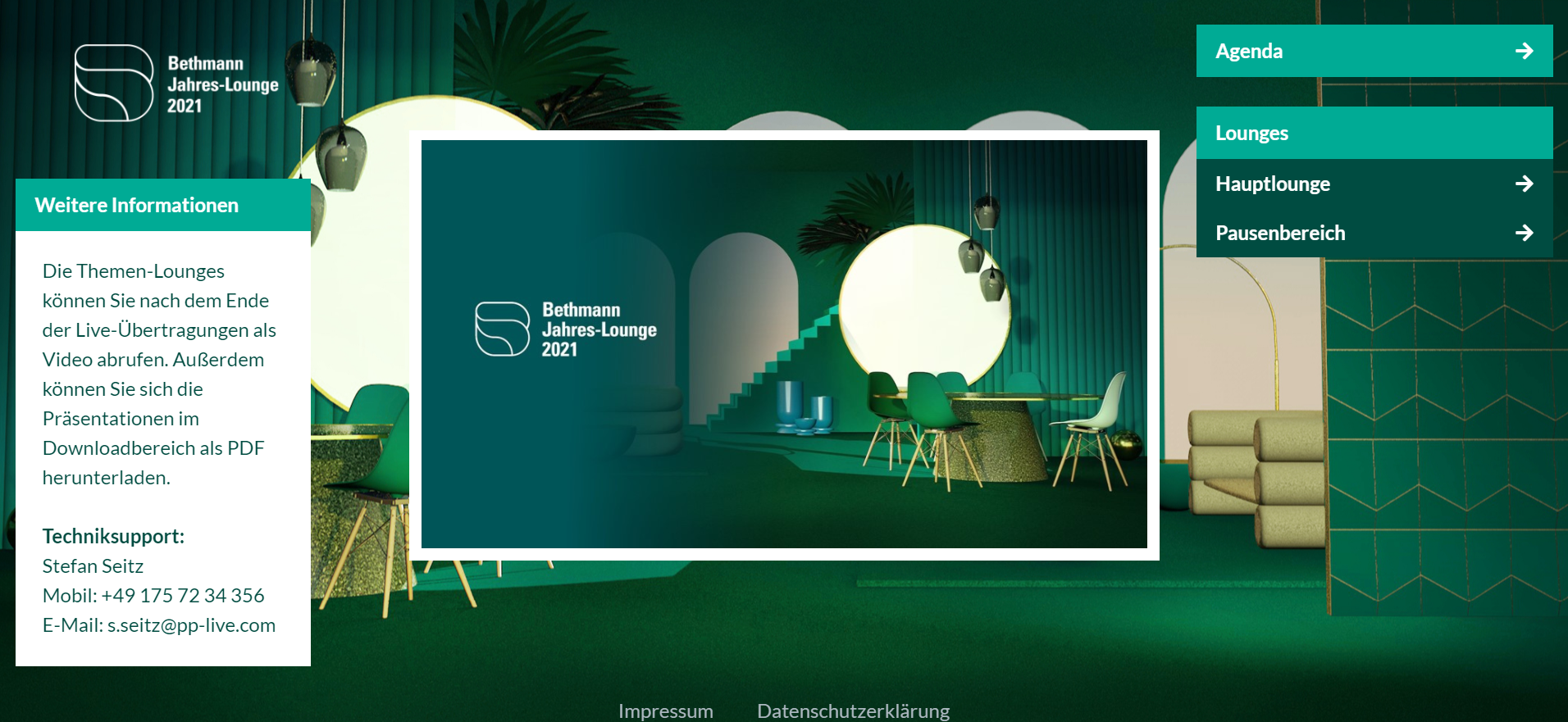 Das passgenau entwickelte Format der Veranstaltungsplattform bot den Gästen eine intuitive Menüführung sowie einen personalisierten Login-Bereich. Für einen fehlerfreien Ablauf und eine exzellente Bildqualität trugen unter anderem auch Neumann&Müller Veranstaltungstechnik (Technik) sowie Wolf ONE (Regie) bei. Die Bethmann Bank war sehr zufrieden mit ihrem ersten virtuellen Event dieser Art und der reibungslosen Umsetzung durch Svenja Voigt Head of Operations bei dem Agenturpartner PP Live.