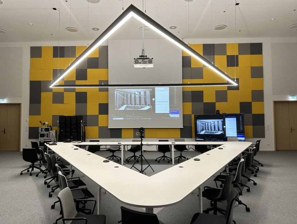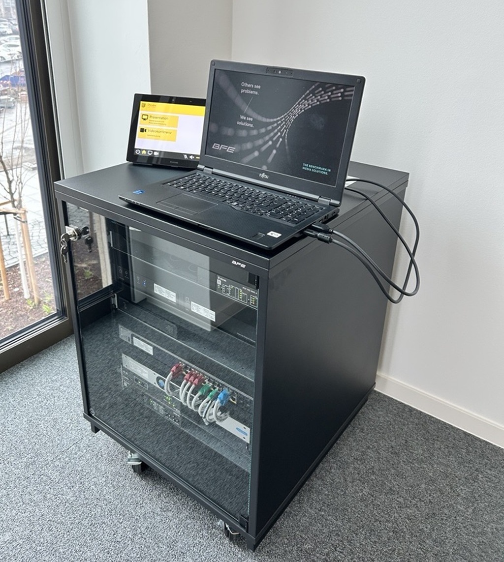 Ein zentrales Element der Lösung bildet der Einsatz mobiler Medienracks, die in 33 Räumen zum Einsatz kamen. Diese beinhalten AV-Steuerung, Signalverteilung sowie Schnittstellen für BYOD-Anwendungen. Ergänzt wurden diese um Bedienpanels mit Touch-Oberflächen und hörunterstützende Systeme in ausgewählten Bereichen. Je nach Raumnutzung kommen Displays oder Projektionstechnik zum Einsatz. Für hybride Meetings wurden zudem Kamerasysteme mit Raumbezug integriert.