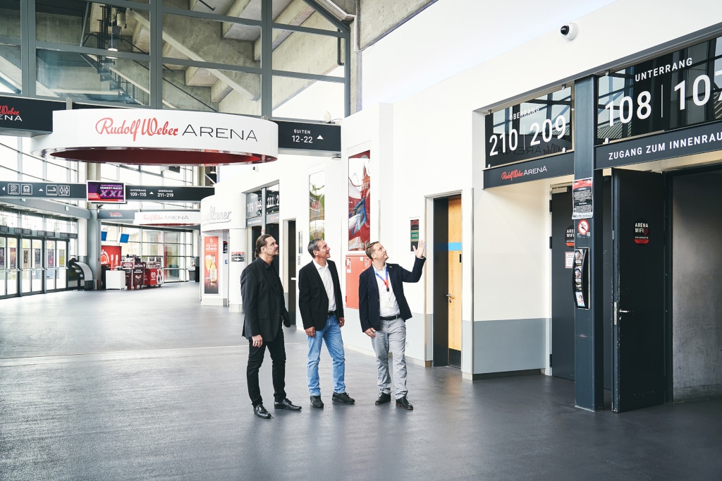 Für die Zutrittskontrolle von Lieferanten und Tagesbesucher:innen am Backstage-Eingang realisierte Bosch ein Besuchermanagementsystem. Die Anmeldung von Besuchenden erfolgt nun über ein Tablet, nach welcher die Mitarbeitenden automatisiert Zutrittskarten ausstellen können. Mit der Lösung lasse sich zudem jederzeit nachverfolgen, wer sich im Objekt befindet. Muss das Gebäude evakuiert werden, könne man zuverlässig klären, ob alle Personen die Arena verlassen haben.