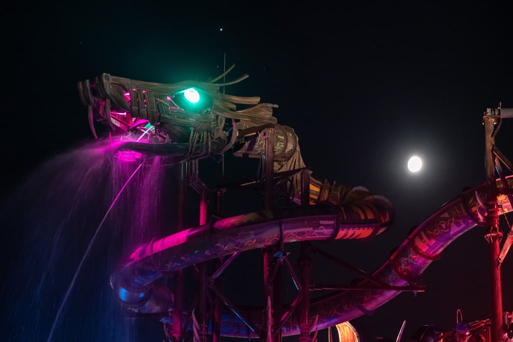 „Die Mavericks waren maßgeblich daran beteiligt, die Merkmale gezielt zum Leben zu erwecken“, kommentiert Elias Jenny. So bestand seine Idee vor allem darin, die Augen sowie den Mund der dominanten Kreatur zum Leben zu erwecken. So sollte für den Besucher ein dominantes, gar leuchtfeuerähnliches Charakterbild erschaffen werden, um der mystischen Figur ihren besonderen Ausdruck zu verleihen. „Wir haben 12 Fixtures in und um die Struktur herum platziert, um eine überlappende Reihe von satten, farbigen Wash-Effekten zu erzeugen. Dies hatte den Effekt, ein insgesamt faszinierendes und gleichzeitig mystisches Gesamtbild zu schaffen, das ideal zur Meeresschlange Svalgur passt.“