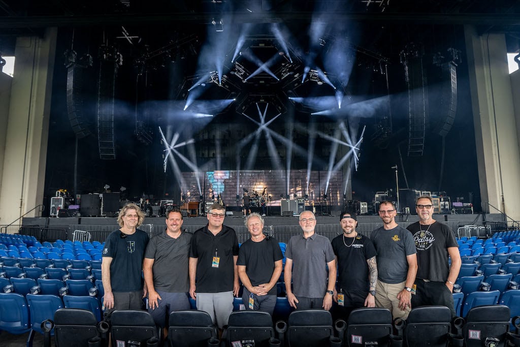 (v. l. n. r.) Greg Botimer, Monitor- & RF-Techniker, mit Paul „Pablo” White, Systems Engineer & SR PA-Techniker, Rob Evans, Broadcast Engineer, Billy Martin, SL PA-Techniker, Ian Kuhn, Monitor Engineer, Josh Horn, Sirius-XM Techniker, Tom Lyon, Senior Systems Engineer und Joe Lawlor, Audio-Archivar (Bild: Sanjay Suchak)