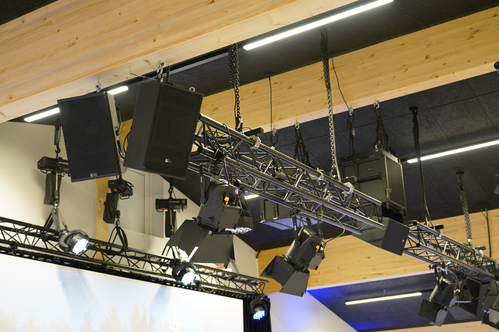 Denn das neue Soundsystem war nie Teil der Hallenplanung. „Erst die Halle, und dann mach’ was draus“, erklärt Gerd Müller das pragmatische Vorgehen der DCG Hessenhöfe bei Blaubeuren. Eine Vorgehensweise, die sich durchaus als Glücksfall erweisen sollte. Denn die Balken der Dachkonstruktion bieten gute Hängepunkte. Die schwarzen Traversen bleiben dem Licht vorbehalten, und die drei Center-Lautsprecher konnten so hoch gehängt werden, dass sie nicht vom Licht des – ebenfalls an schwarzen Traversen geflogenen – Beamers erfasst werden. Die nach Maßgabe von Andreas Haberer vom Stahlbauer gefertigte Adapterplatte, mit der die querliegende ULTRA-X40 am vorderen der beiden 750-LFC befestigt ist, machte die kompakte Konstruktion möglich.