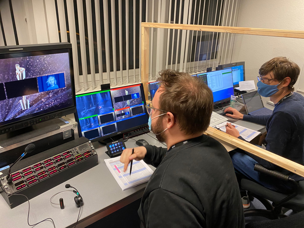 Die 3 Subregien für die Zuschaltung der externen Teilnehmer*innen waren jeweils mit einer vMix Pro Workstation und AJA Corvid Capture Karte sowie einer produktionsspezifischen Konfiguration ausgestattet. Hinzu kam ein Havarie System. Jedes System wurde von zwei Operatoren und redaktionell betreut, wobei der /die Redakteur*in direkt mit den Laudator*innen und Nominierten in Verbindung stand.