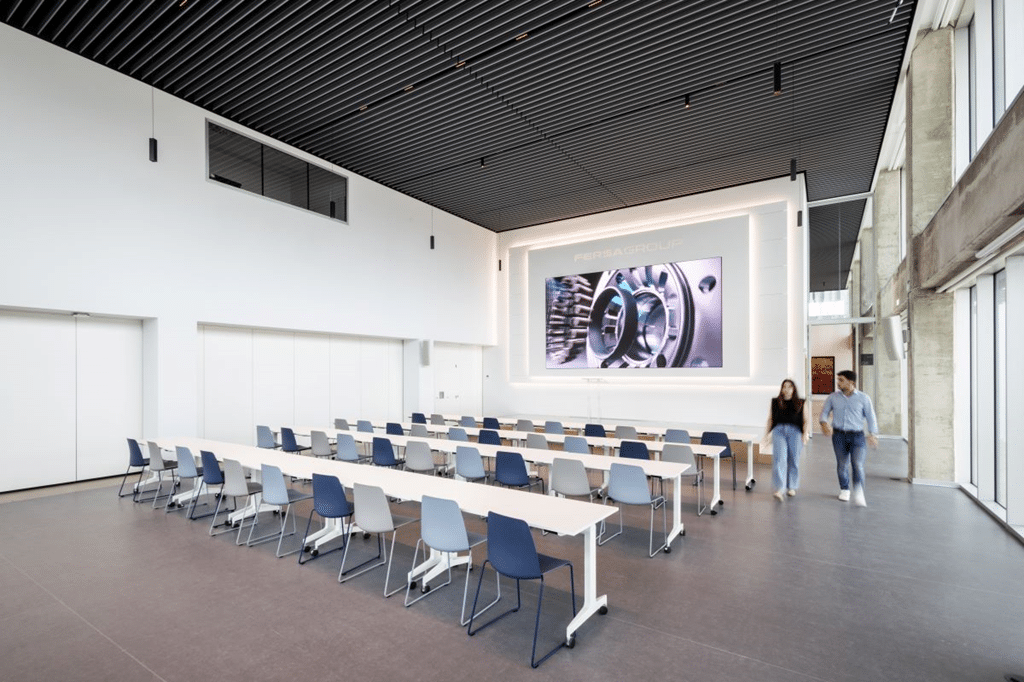 Im Auditorium des Unternehmens mit 40 Sitzplätzen ermöglicht die 5 x 2,75 m große Videowand von Fersa Bearings beeindruckende Präsentationen, sei es im Rahmen einer Teambesprechung oder vor bestehenden oder potenziellen Kunden.