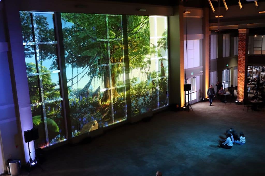 Eine Herausforderung während des Aufbaus habe darin bestanden, mehrere Glasflächen abzudecken, während die Mittelpfosten und architektonischen Elemente weiterhin freiliegend bleiben sollten. „Wir entschieden uns dazu, einen Schaumstoffkern so anzustreichen, dass er farblich zu den Wänden passen würde, damit es keine Farbveränderung entlang der Projektionsoberfläche geben würde.“, erklärt Whetstone.