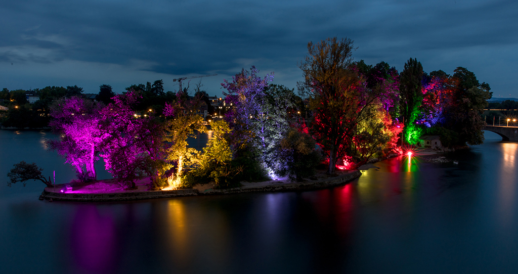 Kurzerhand wurde das naheliegende “Inseli” illuminiert, als das geplante Feuerwerk nicht stattfinden durfte (Bild: Ehrgeiz Lichttechnik GmbH)