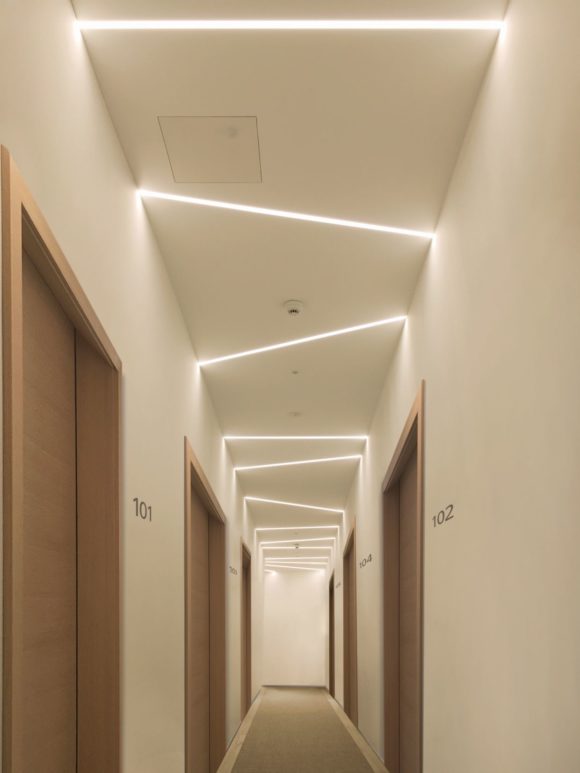 Das Hotel mit 34 Zimmern wurde im Sommer 2018 eröffnet und verfügt im ersten und zweiten Obergeschoss über zwei ca. 1,5 Meter breite und jeweils rund 40 Meter lange Flurbereiche mit minimalem Tageslichteinfall. Für die Gänge hat das Team des auf die Hotellerie und Gastronomie spezialisierten Innenarchitekturbüros Stranger aus Österreich deshalb eine zu ihrem Gesamtkonzept passende Lichtlösung geplant. Diese sollte die Flure optisch verbreitern und die Längen verkürzen sowie einen interessanten Gesamteindruck vermitteln. „Wir haben uns in Anbetracht der langen Gänge mit den unrhythmisch gesetzten Türen ganz bewusst für eine außergewöhnliche Lichtgestaltung entschieden. Die Lichtlinien mit vertikaler Abstrahlung an den Wänden erfüllen zudem eine leitende Funktion, da sie auf die Zimmernummern hindeuten und die Gäste so ganz unbewusst zu ihren Zimmern führen“, erklärt Christian Stranger, Inhaber Innenarchitektur Stranger.