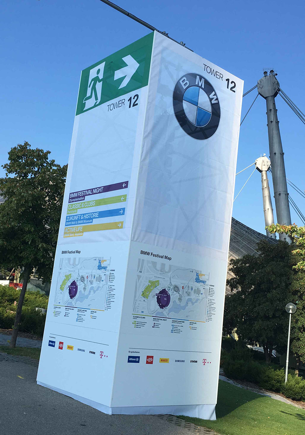 Weiteres Site Material wie Notausgangsbanner, Mobilzaunfahnen, Sichtschutzplanen und Fahnenmasten inklusive Fahnen erleichterten den Zuschauern die Orientierung auf dem Olympiapark-Gelände.