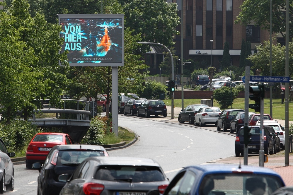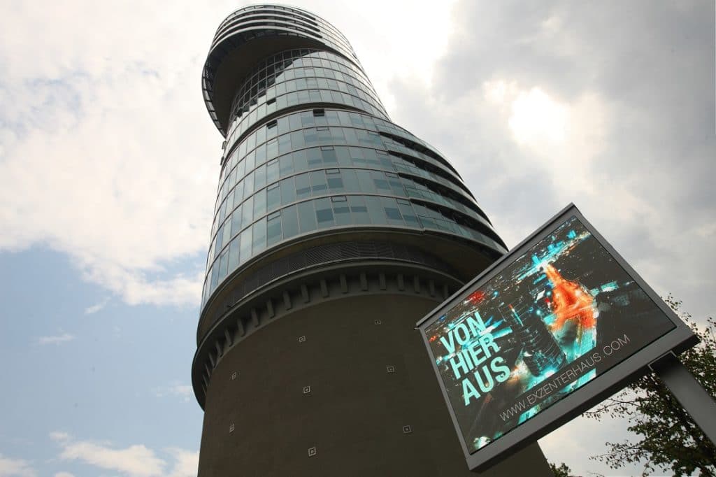 Das exzenterhaus bochum ist ein markantes Hochhaus in der Universitätsstraße. Es ist mit seiner auffälligen Architektur überregional bekannt. Seit Mitte Mai sind an der belebten Straße am Gebäude in jeder Fahrtrichtung je ein großes LED-Display aufgestellt. Die tageslichtfähigen Displays informieren über den 2013 fertig gestellten Business- und Büro-Tower.