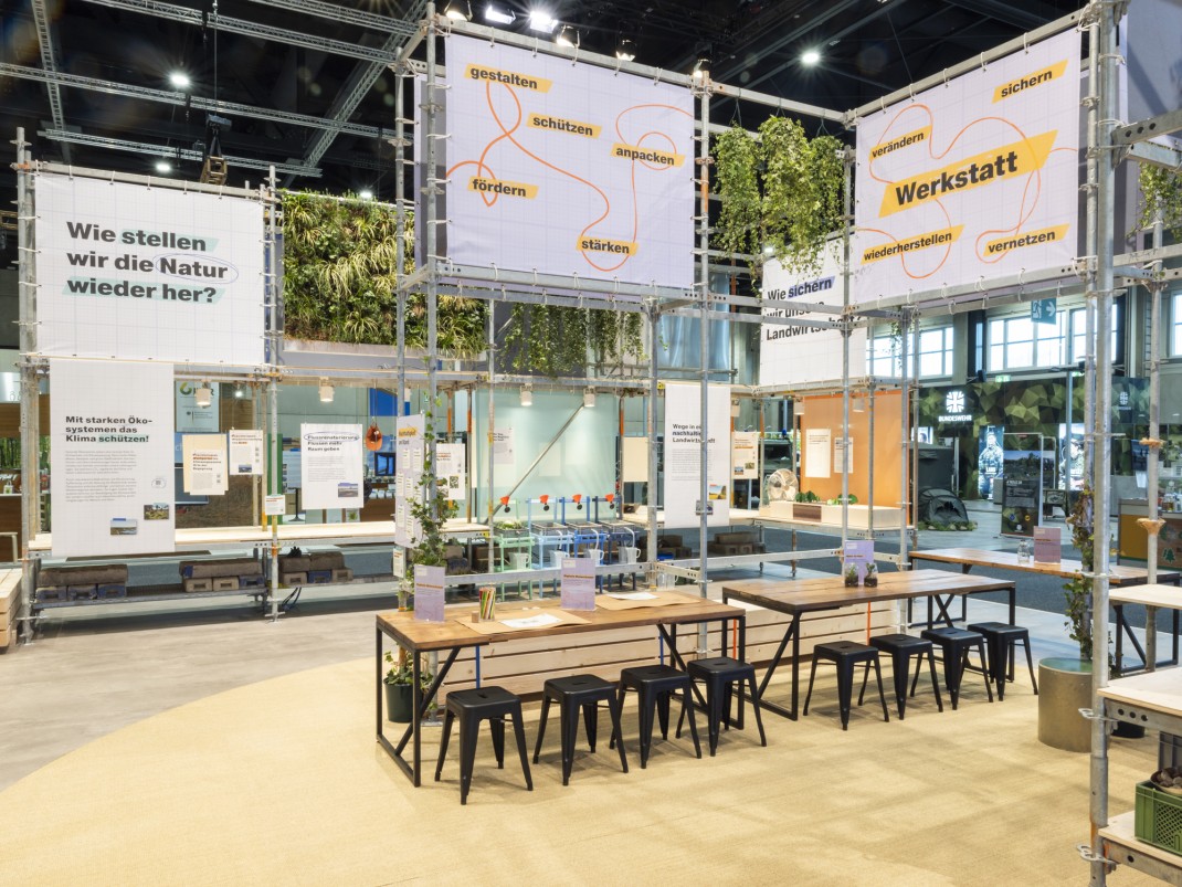 Materialien wie unbehandeltes Holz, Baustellengurte und Stahlseile unterstrichen den Werkstattcharakter des BMUV-Stands. (Bild: Espen Eichhöfer)