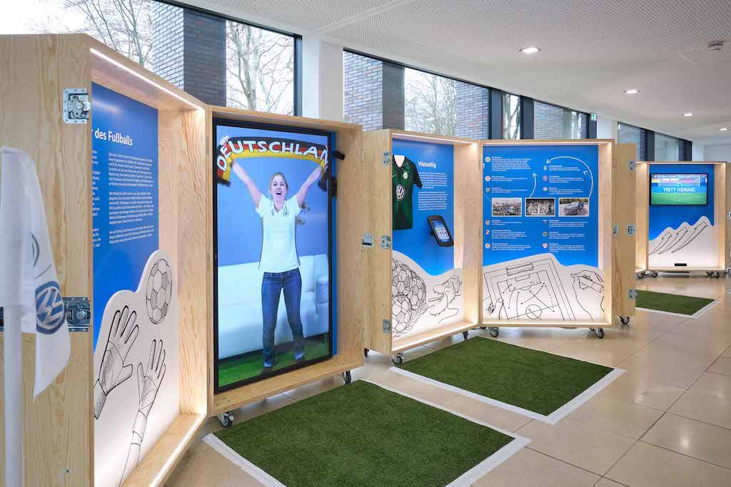 Seit Januar 2019 ist Volkswagen neuer Mobilitätspartner des DFB. Um alle Kolleginnen und Kollegen über die Partnerschaft zu informieren, initiiert Volkswagen eine Wanderausstellung: Der Startschuss fiel am 11. März im Werk Wolfsburg, das Finale findet Ende Mai in Hannover im Werk von Volkswagen Nutzfahrzeuge statt. Ziel der Ausstellung ist es, den Mitarbeiterinnen und Mitarbeitern zu zeigen, wie vielfältig sich Volkswagen im regionalen und internationalen Fußball engagiert, und dass sie alle dazugehören. Ganz nach dem Motto der ersten Werbekampagne mit DFB: „Fußball, das sind wir alle”. Gerd Voss, Leiter Sportkommunikation bei Volkswagen, freut sich über den gelungenen Auftakt: „FischerAppelt hat uns schon in der Konzeption mit ihrem modularen und flexiblen Ansatz überzeugt. Dass wir unsere Botschaften als Infotainment verpacken, nimmt die Belegschaft mit großem Interesse auf.”