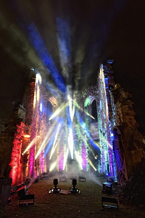 Das Spektakel an der Ruine der St. Franziskuskapelle war eine abwechslungsreiche und spannende Mischung aus klassischer Illumination, Projektionsmapping, Lightshow, pyrotechnischen Effekten und Live-Performance. Den Lightshow-Part bestritten 24 der kompakten und flexiblen Robe Spikie Movinglights – wetterfest verpackt unter Domes von Shelbyrent, und geliefert von Niclen aus Dortmund.