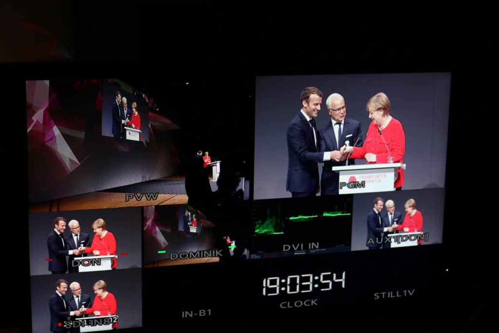 Am Dienstagabend, 10. Oktober, eröffneten Bundeskanzlerin Dr. Angela Merkel und der französische Staatspräsident Emmanuel Macron die Frankfurter Buchmesse im Saal Harmonie des Congress Centers in Frankfurt. Mit umfangreicher Lichttechnik setzte Gahrens + Battermann die Bühne und die prominenten Redner gekonnt in Szene. Mit zwei Kamerazügen fing das Projektteam die Feierlichkeiten ein und übertrug die Bewegtbilder sowohl mittels vier Projektoren auf eine 19 x 6 Meter große Leinwand im Bühnenhintergrund als auch in die VIP- und Nebenräume der Veranstaltung. Auch für TV-Liveübertragungen online und im TV wurde das Bewegtbild-Material zur Verfügung gestellt. Die Beleuchtung der Foto- und Pressewand im Foyer komplettierte die G+B-Dienstleistung an diesem Veranstaltungstag.