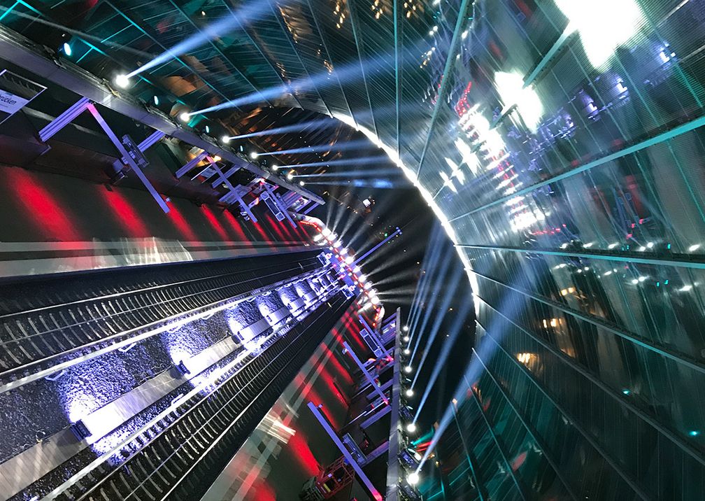 Gemeinsam mit dem Planungsbüro Intermediate Engineering GmbH realisierte das G+B Team eine audiovisuelle Inszenierung mit über 200 Lampen, darunter Moving-Lights, LED-Fluter, LED-Röhren und LED-PAR-Scheinwerfer, im Indoor- und Outdoor-Bereich der neuen Bahn-Station. Als zusätzlicher Eyecatcher wurde mittels sechs Panasonic PT-RZ21K Laserprojektoren ein Videomapping auf die innere Fassade des modernen Gebäudes projiziert. Lichtdesign und Contenterstellung erfolgten dabei durch das Planungsbüro, G+B sorgte sich um die exakte technische Umsetzung.